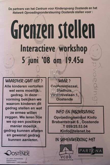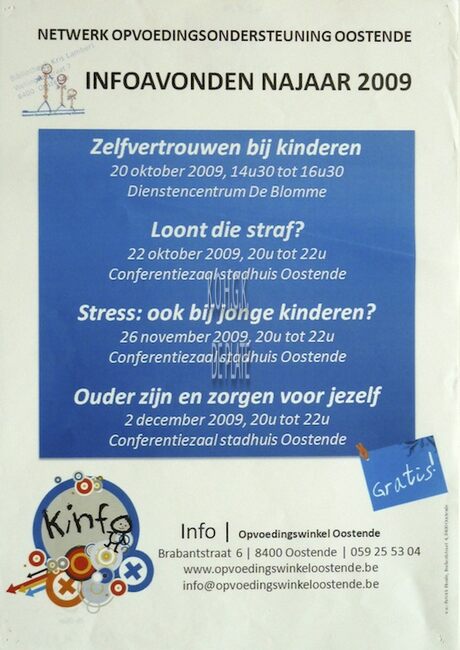 Formaat : 42 x 30 cm. 20/10: Zelfvertrouwen bij Kinderen, Dienstencentrum "De Blomme". 22/10: Loontdie straf? Conferentiezaal Stadhuis Oostende. 26/11: Stress: ook bij jonge kidneren? Conferentiezaal Stadhuis Oostende. 2/12…