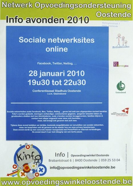 Affiche : Kinfo. Info avonden 2010 : sociale netwerksites online. Conferentiezaal Stadhuis Oostende. 28 januari 2010.