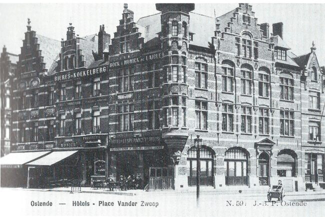 Foto : Het Vandersweepplein of plaats, nu het Ernest Feysplein, hoek Oesterbankstraat (1905). Met van links naar rechts de hotels "De la Gare", "Des Voyageurs" en "De l'Espérance"