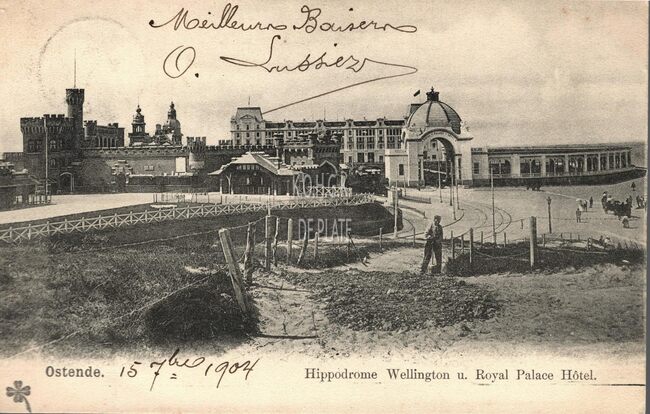 Ostende - Hippodrome Wellington u. Royal Palace Hotel. - Het Royal Palace Hotel, met de hoofdingang gelegen langs de Koerslaan. Links, de Wellingtonrenbaan.