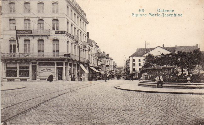 69. Ostende. Square Marie-Joséphine (moet Marie-Joséplein zijn). - Komedieplein. Links op de hoek met de Leopoldlaan, de Banque et Change van Maurice Elleboudt. Rechtdoor de Weststraat (nu Adolf Buylstraat) en ernaast het…