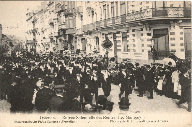 Phototypie H. Climan-Ruyssers Anvers. - Ostende - Entrée Solennelle des Reines (19 Mai 1907). - De groep "Conservatoire du Vieux Système" uit Brussel in de Koningsstraat