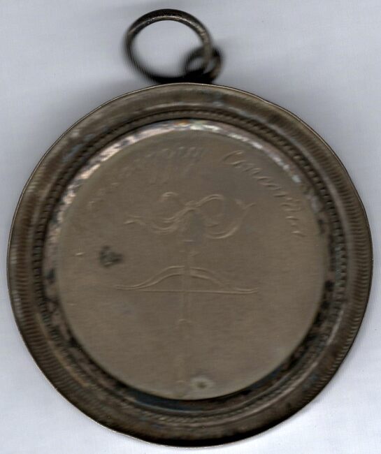 De prijspenning is rond in een vatting met een gladde geprofileerde rand met oog en ring, en is als volgt ingegraveerd