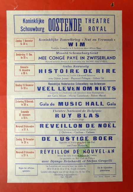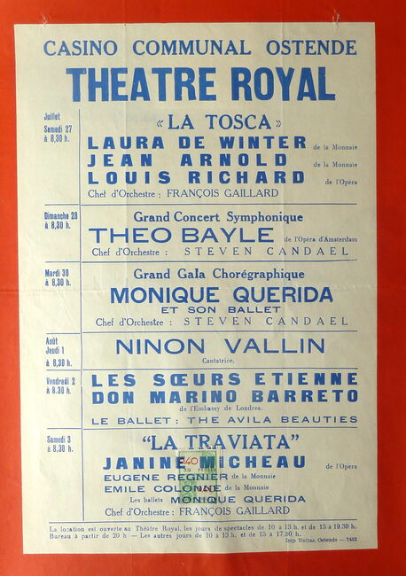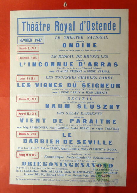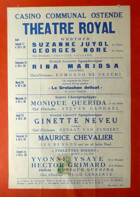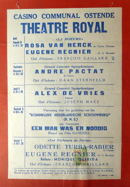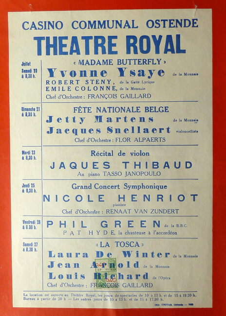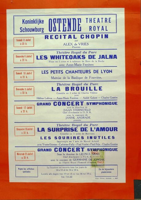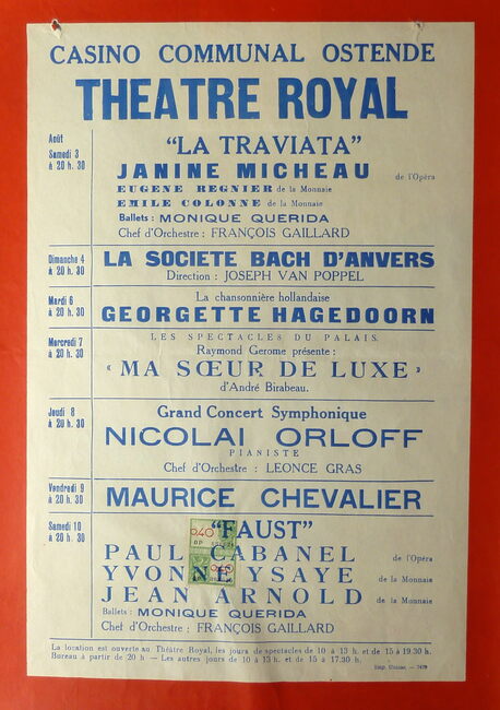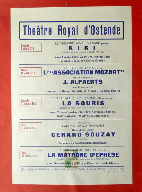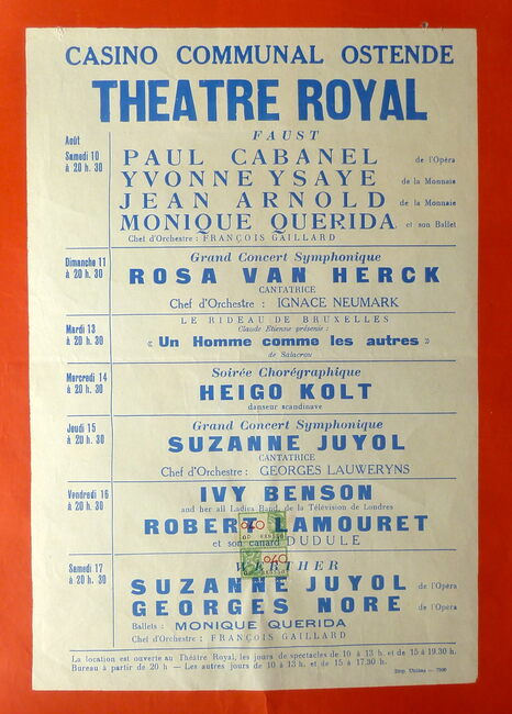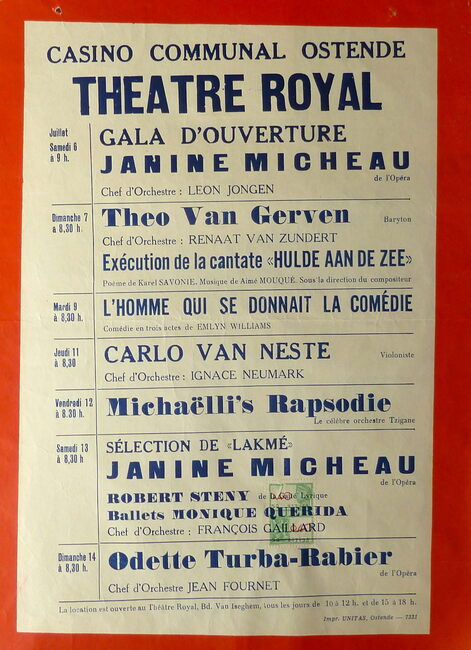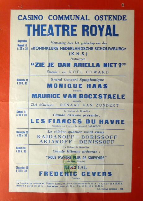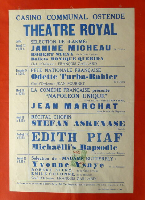 AFFICHESKONINKLIJKE SCHOUWBURG (VAN ISEGHEMLAAN) ; EVENEMENTENPIAF EDITH (1915-1963) (ZANGERES)MICHEAU JANINE (1914-1976) (OPERAZANGERES)TURBA-RABIER ODETTE (1910-2000) (OPERAZANGERES)YSAYE YVONNE (1900- ) (OPERAZANGERES)ASKENASE STEFAN (1896-1985) (PIANIST MUZIEKPEDAGOOG)MARCHAT JEAN (1902-1966) (ACTEUR)QUERIDA MONIQUE (1915-2000) (BALLERINA)