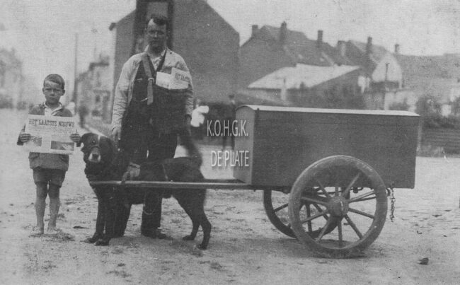 Ter hoogte van de Stuiverstraat. Gérard Depoorter en zoon Maurice, één van de laatste krantenverkopers die nog hun ronde deden met een hondenkar
