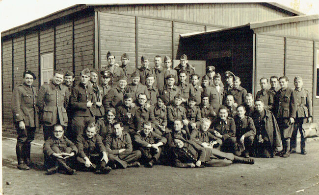 Formaat : 9 x 14 cm. - Groep soldaten - Vermelding achterzijde : Souvenir de notre amitié au stalag IV A