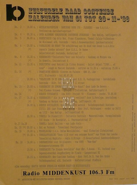Affiche : Kulturele Raad Oostende. Kalender. 15/10 tot 05/11/1989