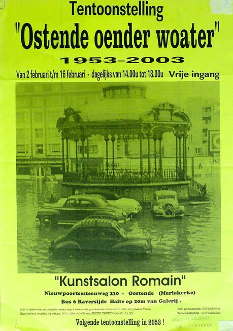 Affiche : Kunstsalon Romain.Tentoonstelling "Ostende oender woater" 1953-2003. Nieuwpoortsesteenweg 210. 02-16/02/2003