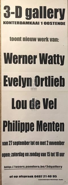 Affiche : Werner Watty, Evelyn Ortlieb, Lou De Vel en Philippe Menten. 3-D gallery. Van 27 september tot 2 november ....(?)