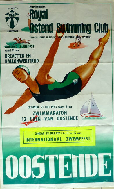 Formaat : 99 c 62 cm. - Tekst gedrukt op de originele affiche van Laboulais uit 1950. - Brevetten en ballonwedstrijd 14/07/1973 ; Zwemmaraton 12 uren van Oostende 21/07/1973 ; Internationaal zwemfeest 29/…