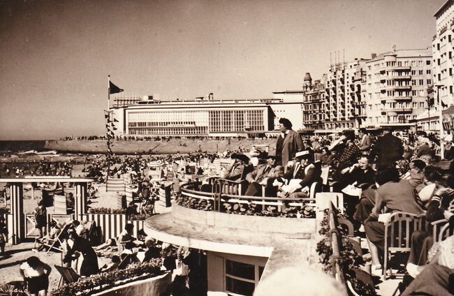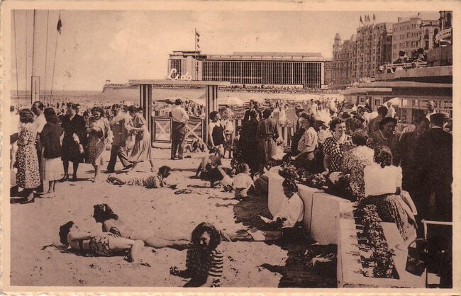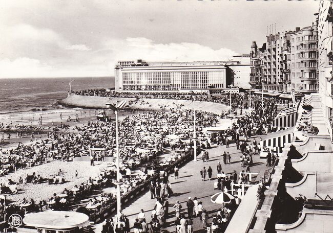 Strandrecreatie op het Groot Strand, nabij de "Lido" en de badinstallaties onder de Albert I-Promenade. Op de achtergrond, de westgevel van het vierde Kursaal