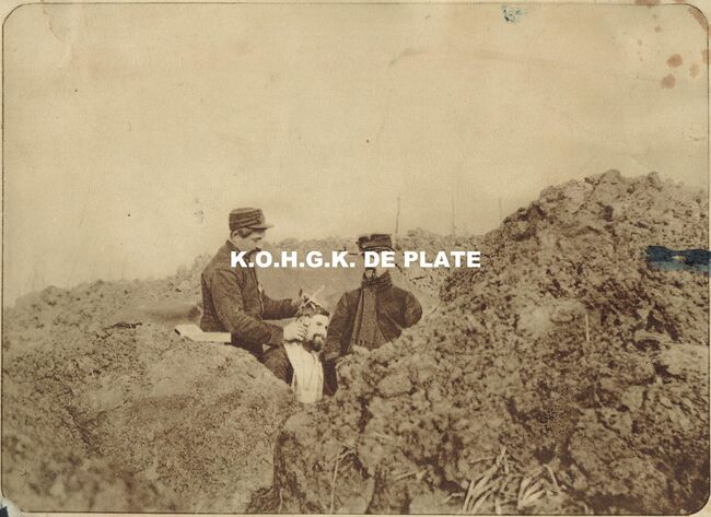 Formaat : 20 x 28 cm. - Un coiffeur improvisé (Dixmuide, decembre 1914). Haar snijden in de loopgraven te Diksmuide in 1914