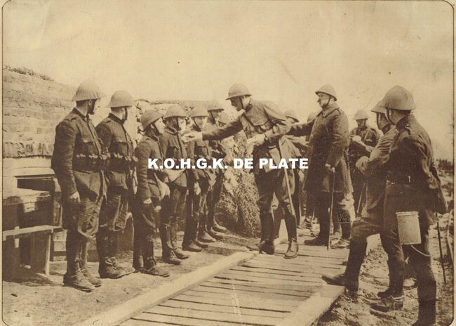 Formaat : 20 x 28 cm. - Le général Dewitte distribue des récompenses à ses hommes (tranchée à Ramscappelle, juillet 1916). - Generaal Dewitte deelt eretekens uit aan zijn mannen in de loopgraven te Ramskapelle