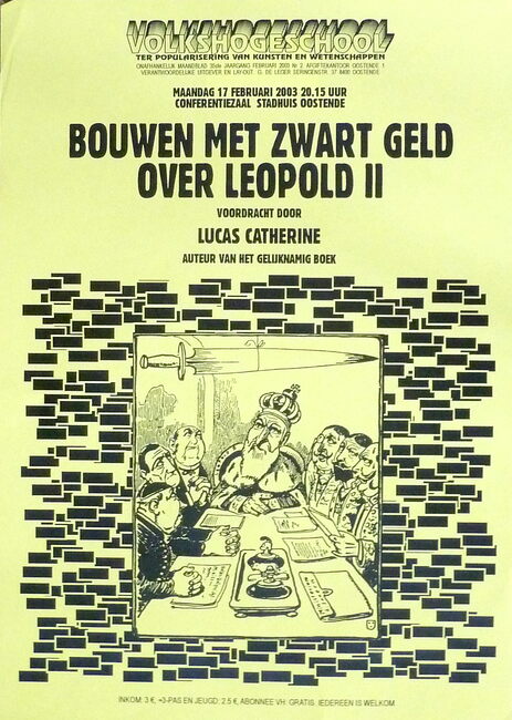 Affiche : Volkshogeschool. Bouwen met zwart geld over Leopold II : voordracht. Conferentiezaal Stadhuis Oostende. 17/02/2003