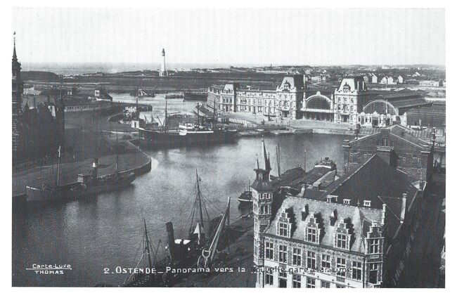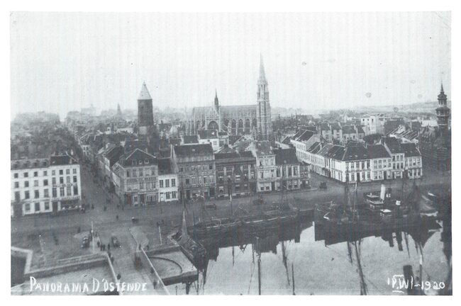 Walschaerts. - Ostende - Panorama pris du Phare. - De havengeul ezien vanaf de vuurtoren op de Oosteroever, het militair domein Halve Maan en de Leopoldsluis.