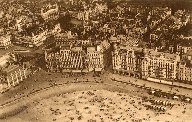 Nels/Thill 13, 137. - Ostende - Les hôtels de la digue pris en avion. Luchtfoto van de Zeedijk, het Groot Strand en detail van de westgevel van het derde Kursaal. We zien ook een gedeelte van het centrum rond de…