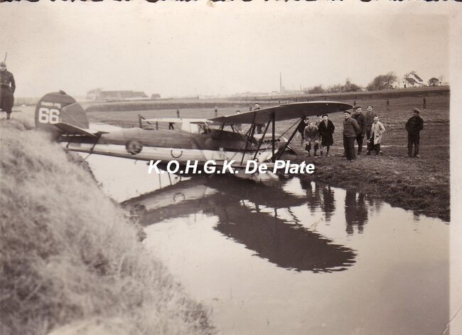 Foto 8.5 x 6. Een Gloster Gladiator, jachtvliegtuig van het "La Comète" smaldeel van de Belgische Luchtmacht, na een kraaklanding in het Provincie Geleed.