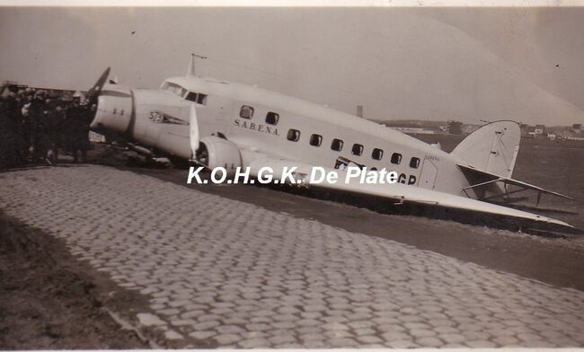 Foto 11 x 605. Woensdag 22 maart 1939 landde de Savoia Marchetti, S73-00-AGR, van SABENA, te ver op het veld en eindigde ziin rit op de verhoogde Steense dijk. Lit. opg. "Het vliegveld te Stene - Oostende 1920 - 1945…