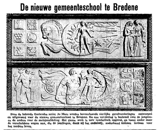 Een werk van Jo MAES. Het ceramieken basreliëf voor de buitenmuur van de gemeenteschool in Bredene