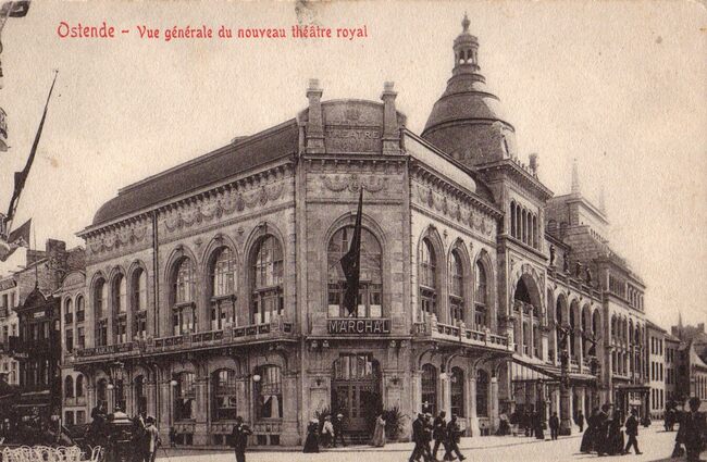 Dr Trenkler. - Ostende - Le Théàtre Royal. - Eén kaart bijgekleurd. - De Koninklijke Schouwburg en "Maison Marchal", gezien hoek Vlaanderenstraat en Van Iseghemlaan.