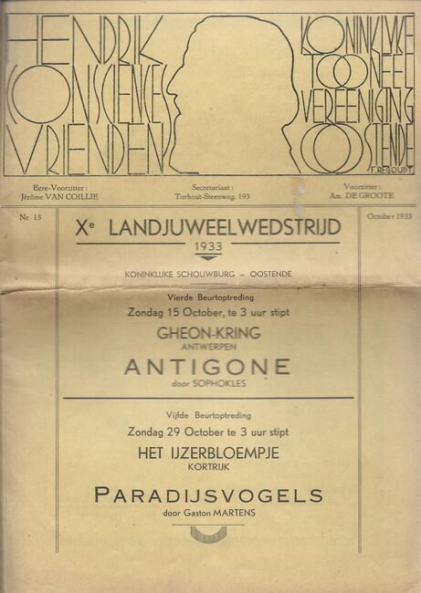 KONINKLIJK LANDJUWEEL (TONEEL)TONEEL ; WEDSTRIJDENGHEON-KRING (TONEELVERENIGING) (ANTWERPEN)ANTIGONE (TONEELSTUK)SOPHOKLES (DICHTER)HET IJZERBLOEMPJE (TONEELVERENIGING) (KORTRIJK)DE PARADIJSVOGELS (TONEELSTUK)MARTENS GASTON MARIE (1883-1967) (AUTUER)TONEELSTUKKENKONINKLIJKE SCHOUWBURG (VAN ISEGHEMLAAN) ; TONEEL
