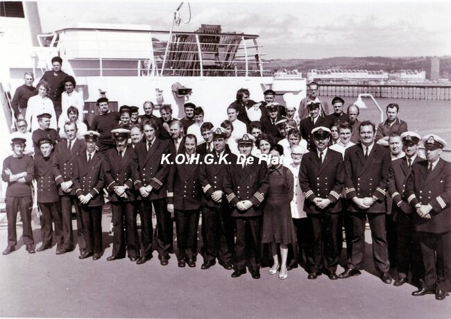 Afdruk, formaat : 29.5 x 21 cm. - Met commandant Van Caeneghem. Eveneens op de foto, R. Steyaert en R. Martinsen. Uiterst rechts, chief-steward, Harold Vanhaelst.