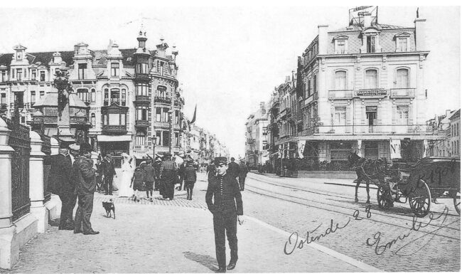 Het pleintje tussen de Van Iseghemlaan en de Langestraat (thans Monacoplein). Toen stationeerden er reeds enkele auto's, maar talrijker waren nog de koetsiers met hun prachtige wagens (circa 1910) (Omer Vilain)