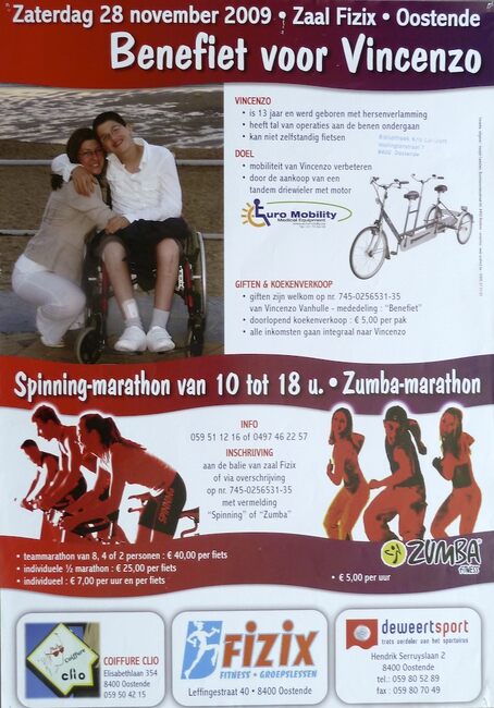 Formaat : 60 x 42 cm. VINCENZO. Is 13 jaar en werd geboren met hersenverlamming. Heeft een tal van operaties aan de benen ondergaan en kan niet zelfstandig fietsen. DOEL. Mobiliteit van Vincenzo verbeteren. Door de aankoop…