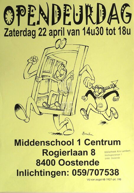Affiche : Middenschool 1 Centrum. Opendeurdag. Rogierlaan 8. 22 april .... (?)