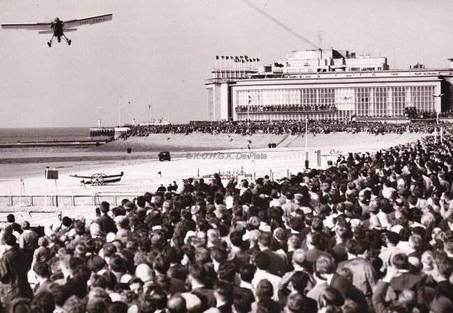 Demonstratie door een licht vliegtuigje op de "Dag van de Luchtmacht" aan het Groot Strand nabij de Kursaal , gelegen langs de Albert I-promenade (Petit Nice) in de zomer van 1954. Mooi weer en een zee van volk…