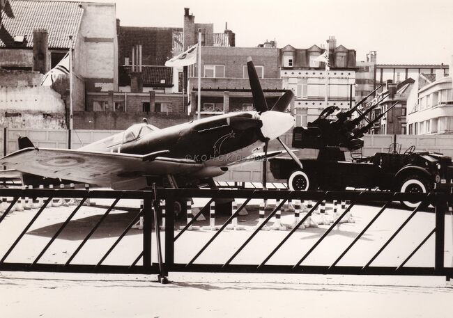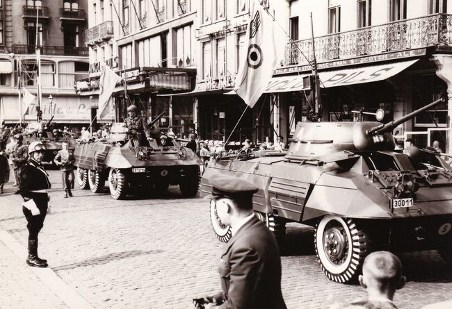 Lichte pantserwagens van onze luchtmacht op het Wapenplein tegen de hoek met de Vlaanderenstraat. Centraal, de Falstaff.
