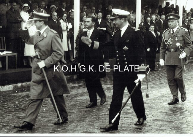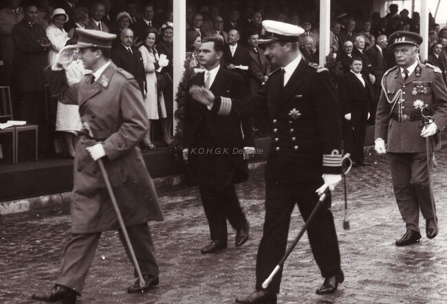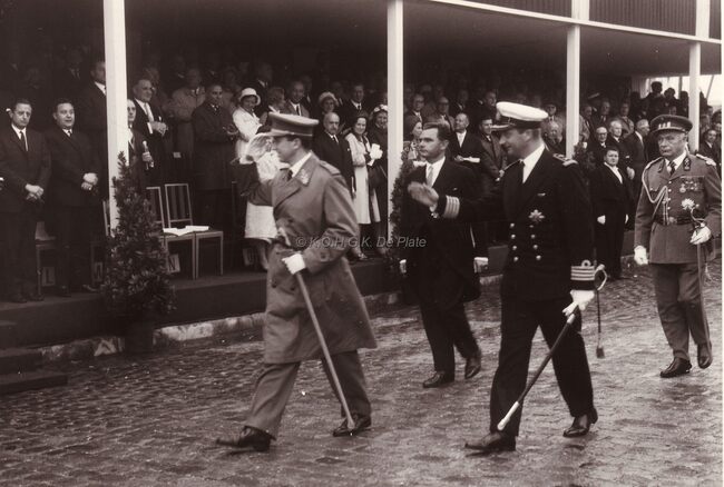Koning Boudewijn en Prins Albert voor de eretribune op de Visserskaai ter gelegenheid van de Nationale Feestdag 1966. Achter hen volgt er een legergeneraal. In de tribune zien we de schepenen Raymond Miroir en Kamiel…