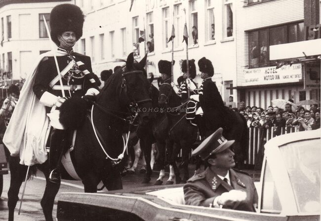 Koning Boudewijn op de Visserskaai waar het défilé van 21-07-1966 zal passeren. Hij wordt begeleid door een detachement van de Rijkswacht (mét berenmutsen).