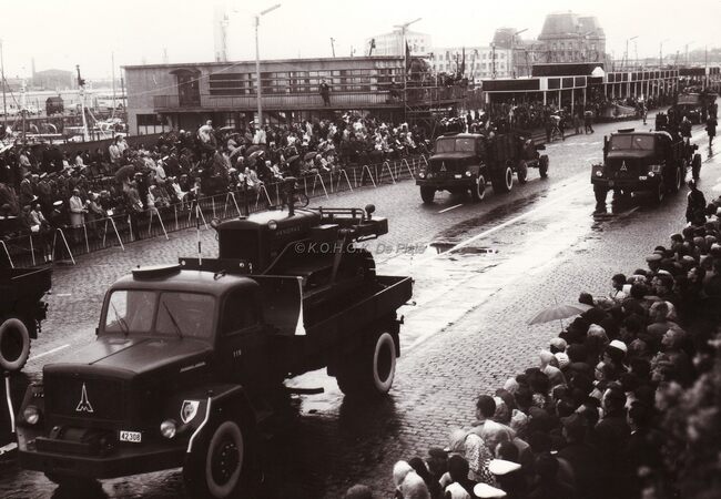 Defilé van gepantserde troepentransportwagens op de Visserskaai. Centraal de garnaalmijn, rechts ervan de eretribune. Op de achtergroind het Zeestation. Ondanks het slechte weer veel volk.