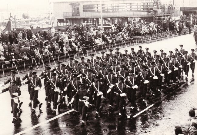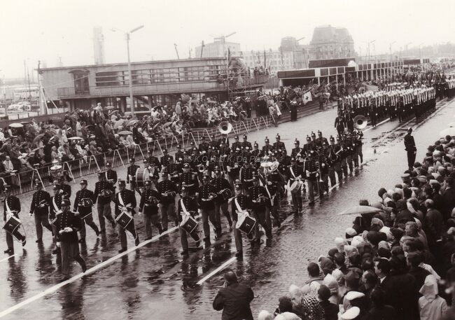 De harmonie van de Gidsen (?) komt voorbij de eretribune en de garnaalmijn tijdens het defilé van 21-07-1966 op de Visserskaai.