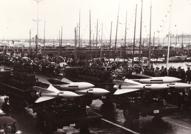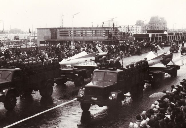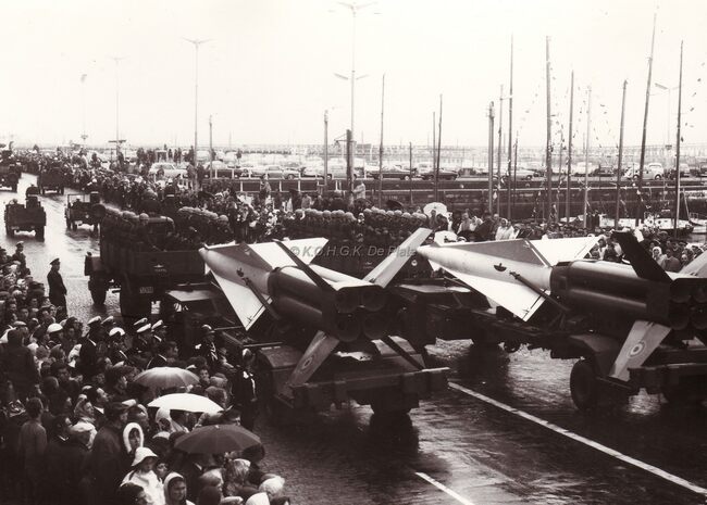 Een detachement van de luchtdoelartillerie met Hawk (?) raketten op de Visserskaai tijdens het défile van 21-07-1966. Links, de Garnaalmijn
