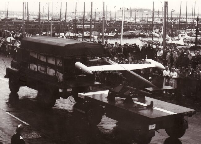Vrachtwagen van de luchtdoelartillerie met een onbemand vliegtuigje dat de oefendoelen voorttrok,op de Visserskaai tijdens het défile van 21-07-1966. Rechts, het Montgomerydok