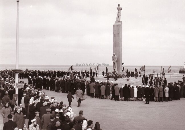 Hulde bij het monument der zeelieden op de dag dat de "Kamina" onze troepen terugbracht uit Congo.Links de stadsharmonie,rechts diverse oudstrijdersverenigingen (met vaandel).