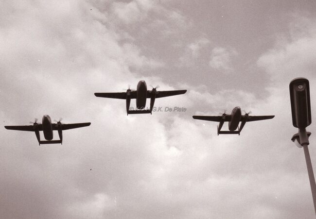 Drie Flying Box cars, vliegtuigen toen in gebruik om parachutisten te droppen,vliegen over het Zeeheldenplein op de dag dat onze troepen terugkwamen uit Congo