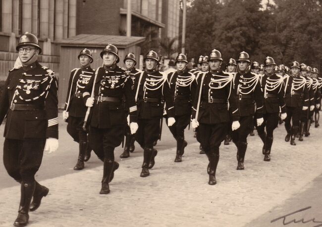 Defile van de Rijkswacht voor het Gerechtshof, toen dienstdoend stadhuis, aan het Canadaplein.