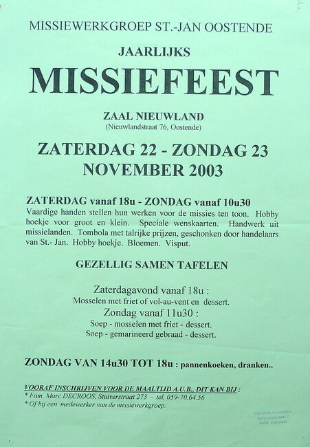 Affiche : Missiewerkgroep St.- Jan Oostende. Jaarlijks Missiefeest. Zaal Nieuwland. 22-23/11/2003