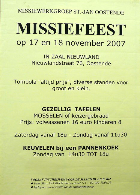 Affiche : Missiewerkgroep St.- Jan Oostende. Jaarlijks Missiefeest. Zaal Nieuwland. 17-18/11/2007