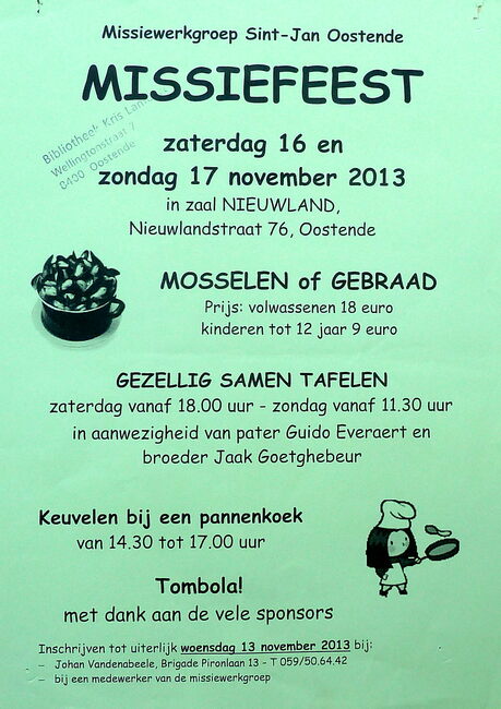 Affiche : Missiewerkgroep St.- Jan Oostende. Jaarlijks Missiefeest. Zaal Nieuwland. 16-17/11/2013