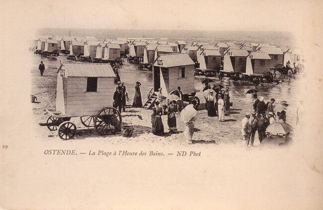 [Neurdein], ND Phot, nr.29. - Ostende - La Plage à l'Heure des Bains. - Een gedeelte van het Groot Strand, met aan de vloedlijn de traditionele badkarren. Vrouwen met hun parasols en mannen keuvelen. Misschien gaan…