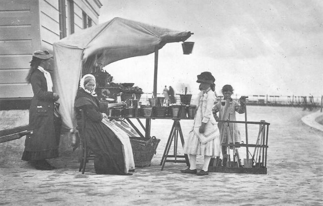 Nels. - Het Koninklijk Chalet langs de Zeedijk, gezien vanaf het Groot Strand. Strandrecreatie in de Belle Epoque