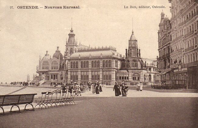 We zien de Zeedijk en een gedeelte van de noordgevel van het derde Kursaal. Vrouwen op wandel met hun kinderen. Oostende in de Belle Epoque.