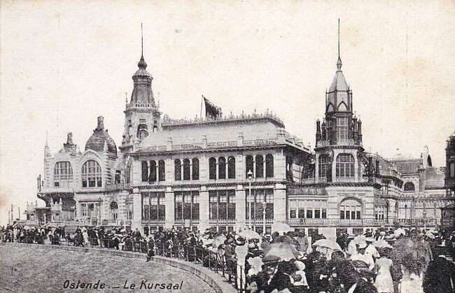 Oostende in de Belle Epoque. Strandrecreatie op het Groot Strand. De westelijke gevel van het derde Kursaal langs de Zeedijk