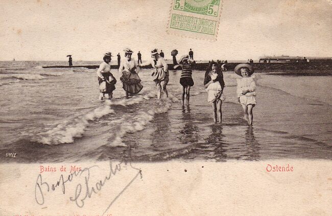 Edit. V.G. [= Victor Grégoire], 42, Avenue du Midi, Bruxelles. N°84982. Ostende - Bains de mer. - Vrouwen en kinderen doen aan pootjebaden, met op de achtergrond een golfbreker. Oostende in de Belle Epoque
