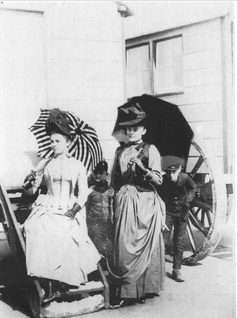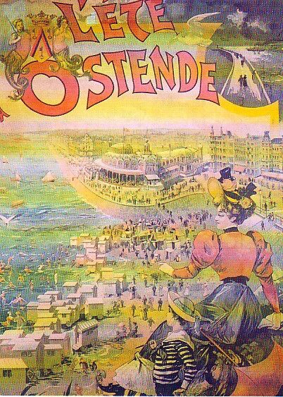 Affiche op kunststof plaat geplakt. Formaat : 125 x 210 cm. - Oostende in de Belle Epoque. Het Groot Strand met de traditionele badkarren. De Zeedijk en het tweede kursaal. Een dame en jongen modieus gekleed.