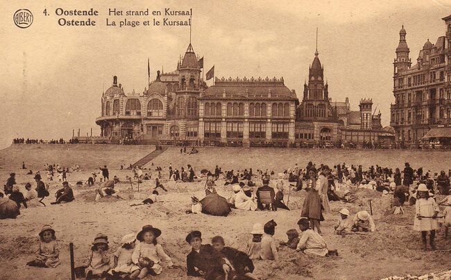 Albert, N° 4. - Oostende - Het strand en Kursaal. Ostende - la plage et le Kursaal. - Strandrecreatie op het Groot Strand nabij de westelijke gevel van het derde Kursaal langs de Zeedijk. Kinderen poseren voor de…
